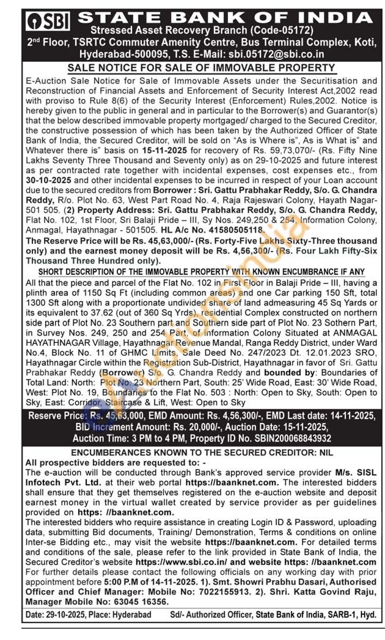 All that the piece and parcel of the Flat No. 102 in First Floor in Balaji Pride III, having a plinth area of 1150 Sq Ft (including common areas) and one Car parking 150 Sft, total 1300 Sft along with a proportionate undivided share of land admeasuring 45 Sq Yards or its equivalent to 37.62 (out of 360 Sq Yrds), residential Complex constructed on northern side part of Plot No. 23 Southern part and Southern side part of Plot No. 23 Sothern Part. in Survey Nos. 249, 250 and 254 Part, of information Colony Situated at ANMAGAL HAYATHNAGAR Village, Hayathnagar Revenue Mandal, Ranga Reddy District, under Ward No.4, Block No. 11 of GHMC Limits, Sale Deed No. 247/2023 Dt. 12.01.2023 SRO, Hayathnagar Circle within the Registration Sub-District, Hayathnagar in favor of Sri. Gattu Prabhakar Reddy (Borrower) S/o. G. Chandra Reddy and bounded by: Boundaries of Total Land: North: Plot No. 23 Northern Part, South: 25' Wide Road, East: 30' Wide Road, West: Plot No. 19, Boundaries to the Flat No. 503 North: Open to Sky, South: Open to Sky, East: Corridor, Staircase & Lift, West: Open to Sky