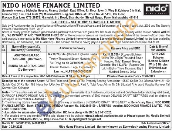 Description of the secured Asset: All That Piece And Parcel Of The Property Bearing Area Admn 105.50 Sq Mtr Out Of Area Admn 211.00 Sq Mtr Out Of Rs No.1488 Hissa No. 1.Plot No.87, Hissa No.1, Part A. Total Area Admn 1h 53r Situated At A Ward Kasaba Karveer Tal Karveer Dist Kolhapur