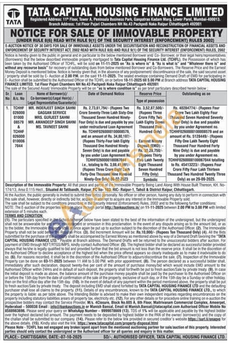 All that piece and parcel of the Immovable Property Being Land Along With House Built Thereon, KH. No-174/13, Arsa 0.115 Hect, Situated At Talibandh, Raipur, PC No-103, RIC- Raipur-1, Tahsil & District Raipur Chhattisgarh