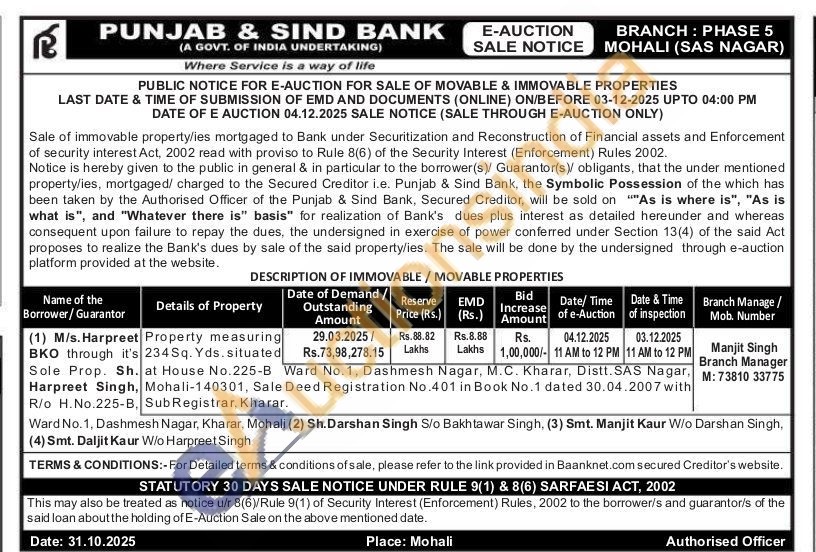 Property measuring 234 Sq. Yds.situated House No. 225-B Ward No.1, Dashmesh Nagar, M.C. Kharar, Distt. SAS Nagar, Singh, Mohali-140301, Sale Deed Registration No.401 in Book No.1 dated 30.04.2007 with R/o H.No.225-B, SubRegistrar