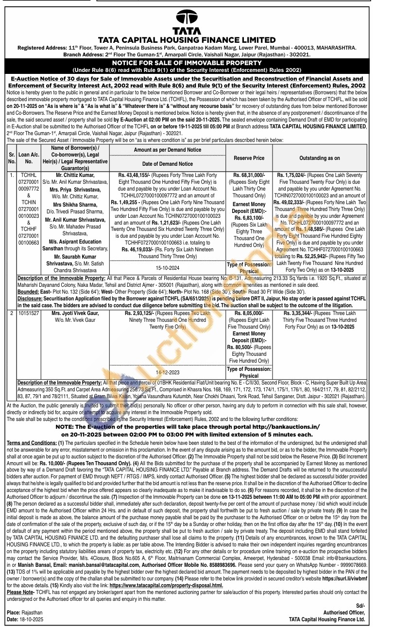 1) All that Piece & Parcess of Residential House bearing No. B-131, Admeasuring 213.33 Sq. Yards ie. 1920 Sq. Fl., situated al Maharishi Dayanand Colony, Naka Madar, Tehsi and District Ajmer- 305001 (Rajasthan), along with common amenities as mentioned in sale deed. Bounded: East-Plot No. 132 (Side 64); West- Other Property (Side 64): North-Plot No. 168 (Side 30); South-Road 30 Fr Wide (Side 30').