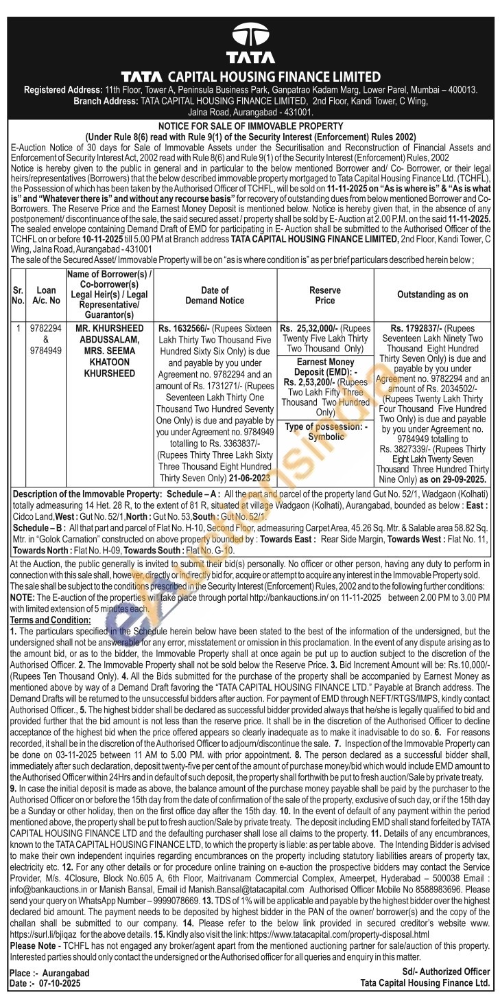 Schedule-A: All the part and parcel of the property land Gut No. 52/1, Wadgaon (Kolhati) totally admeasuring 14 Het. 28 R, to the extent of 81 R, situated at village Wadgaon (Kolhati), Aurangabad, bounded as below: East: Cidco Land West: Gut No. 52/1 North: Gut No. 53. South: Gut No. 52/1 Schedule-B: All that part and parcel of Flat No. H-10, Second Floor, admeasuring Carpet Area, 45.26 Sq. Mtr. & Salable area 58.82 Sq Mtr. in "Golok Carnation" constructed on above property bounded by: Towards East: Rear Side Margin, Towards West: Flat No. 11. Towards North: Flat No. H-09. Towards South: Flat No. G-10.