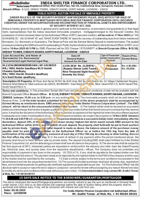 All Piece And Parcel Of Plot No-B-05 Area 560 Sq. feet Khasra No- 62 Village Chakbankat Pargana-Mahona Tehsil-Baksi Ka Talab Lucknow Up 226021, BOUNDARY:- East-Road 20 Ft Wide, West-Vacant Plot C-5, North-Vacant Plot, South-Vacant Plot C-4,