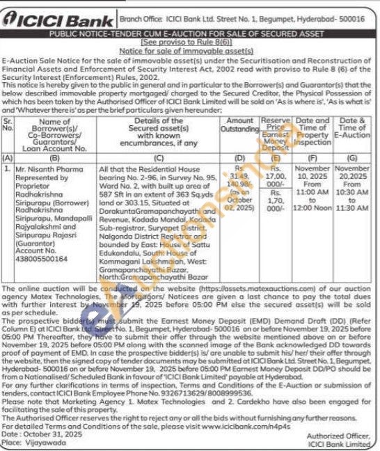 All that the Residential House bearing No. 2-96, in Survey No. 95. Ward No. 2, with built up area of 587 Sft in an extent of 363 Sqyds land or 303.15. Situated at Darakunta Gramapanchayathi and Revenue, Kadada Mandal, Kodada Sub-registrar, Suryapet District, Nalgonda District Registrar and bounded by East: House of Sattu Edukondalu, South: House of Kommagani Lakshmaiah, West: Gramapanchayathi Bazar, North Gramapanchayathi Bazar