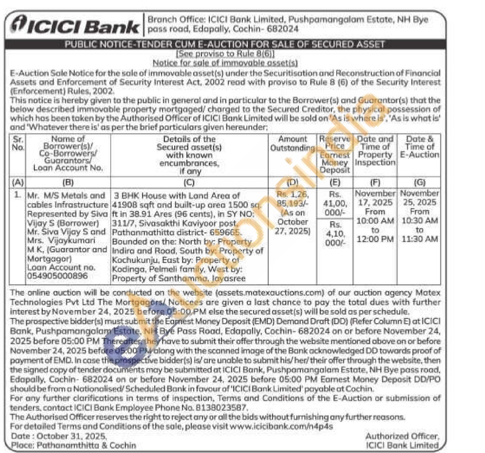3 BHK House with Land Area of 41908 sqft and built-up area 1500 sq. ft in 38.91 Ares (96 cents), in SY NO: 311/7, Sivasakthi Kaviyoor post. Pathanmathitta district- 659665. Bounded on the: North by: Property Indira and Road, South by: Property of Kochukunju, East by: Property of Kodinga, Pelmeli family, West by: Property of Santhamma, Jayasree