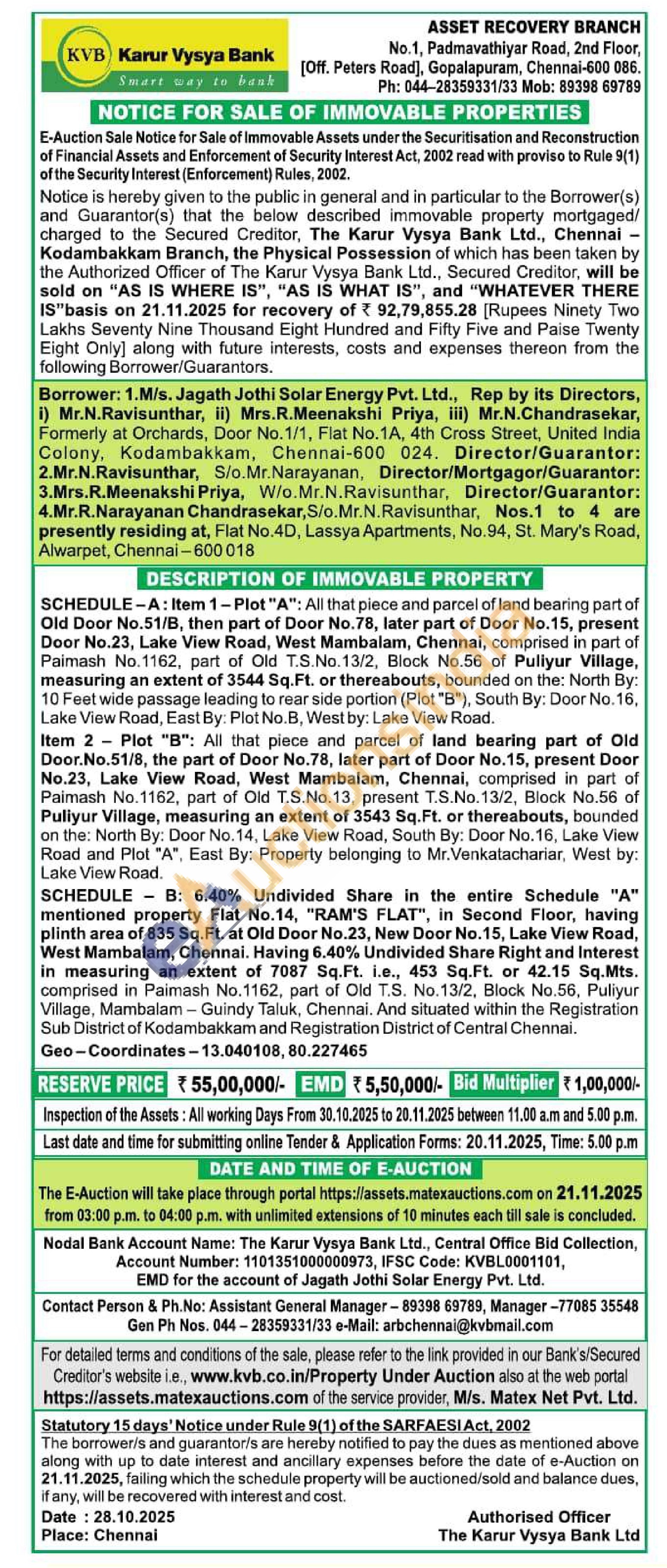 Contact Person & Ph.No: Assistant General Manager-89398 69789, Manager-77085 35548 Gen Ph Nos. 044-28359331/33 e-Mail: arbchennai@kvbmail.com