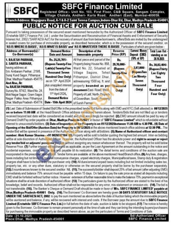 All that piece and parcel of the Property being House No. 858, Ward No. 22, Situated at Village Sagore, Tehsil Pithampur, District Dhar, admeasuring 1500 sq. ft. and properly bounded as per document-East-Road, West-Property of Latif, North-Property of Goverdhan, South-Property of Sursh Parmar