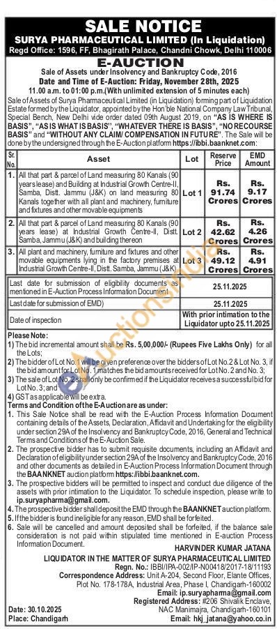 All plant and machinery, furniture and fixtures and other movable equipments lying in the factory premises al Industrial Growth Centre-II, Distt. Samba, Jammu (J&K)
