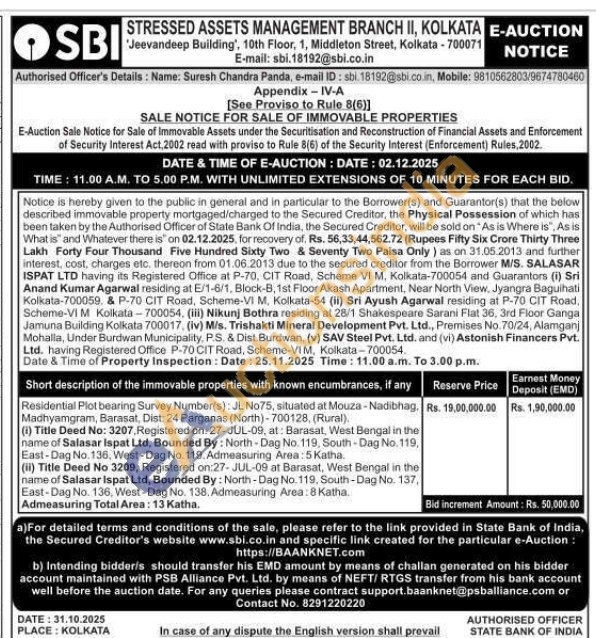 Residential Plot bearing Survey Number(s): JL No75, situated at Mouza-Nadibhag. Madhyamgram, Barasat, Dist: 24 Parganas (North)-700128, (Rural). (i) Title Deed No: 3207, Registered on: 27-JUL-09, at: Barasat, West Bengal in the name of Salasar Ispat Ltd, Bounded By: North-Dag No. 119, South-Dag No. 119, East-Dag No.136, West-Dag No. 119. Admeasuring Area: 5 Katha. (ii) Title Deed No 3209, Registered on:27-JUL-09 at Barasat, West Bengal in the name of Salasar Ispat Ltd, Bounded By: North-Dag No. 119. South-Dag No. 137, East-Dag No. 136, West-Dag No. 138. Admeasuring Area: 8 Katha. Admeasuring Total Area: 13 Katha.