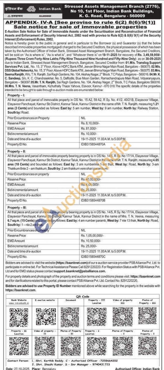 All that piece and parcel of immovable property bearing property is in OS No. 14/5, R Sy. No 17/1A, Elayevoor Village, Elayavoor Panchayat, Kannur Sb District, Kannur Taluk, Kannur District in the name of Mr. T. N. Ranjith, measuring 4.05 ares (10 Cents) and bounded as follows: East by: 3 am numberinte 1-am thak. West by: Road, North by: 3-am Thakkumente 2-am thakkum, South by: 2 am thakkum vere ohari parambum.