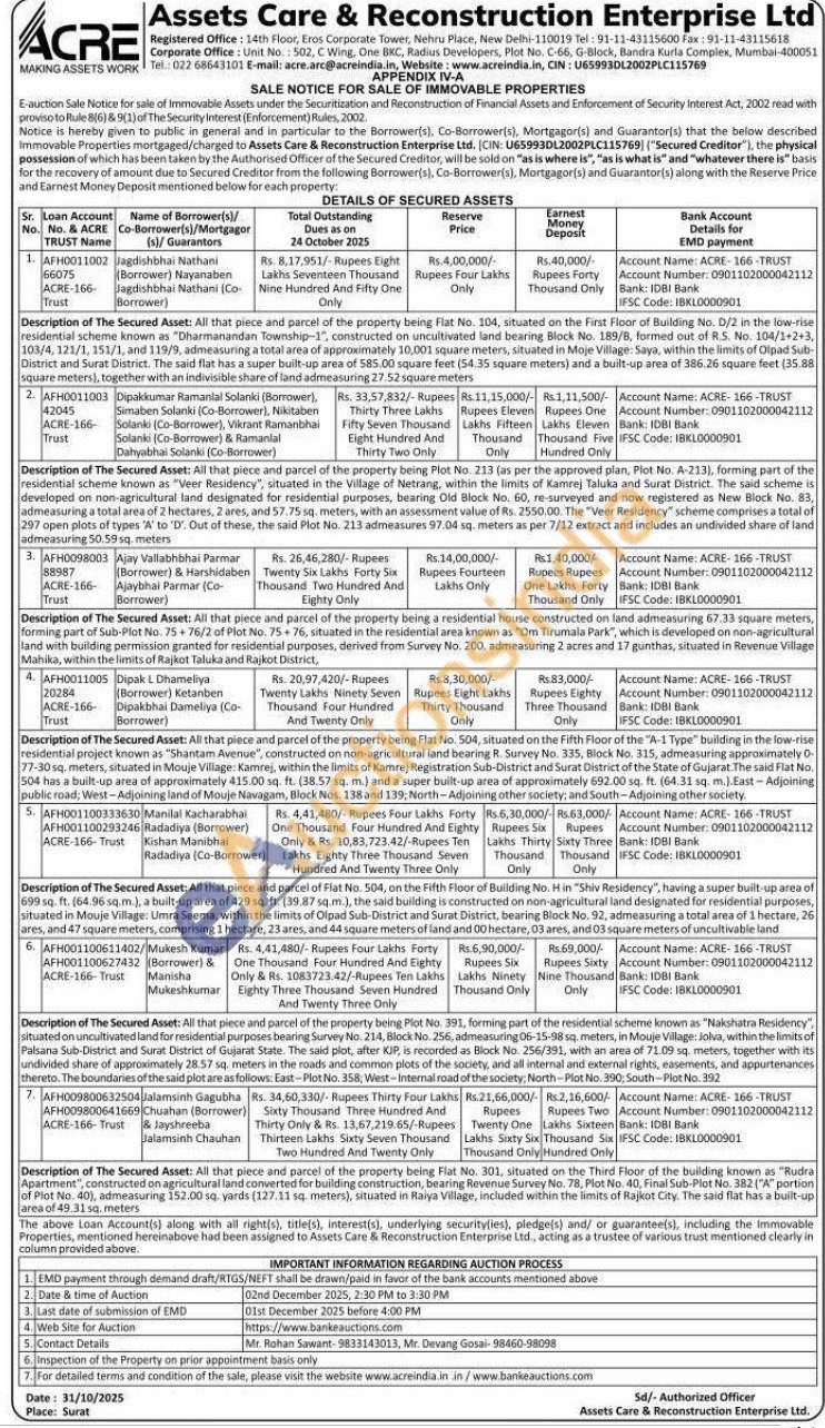 Description of The Secured Asset: All that piece and parcel of the property being Flat No. 301, situated on the Third Floor of the building known as "Rudra Apartment", constructed on agricultural land converted for building construction, bearing Revenue Survey No. 78, Plot No. 40, Final Sub-Plot No. 382 ("A" portion of Plot No. 40), admeasuring 152.00 sq. yards (127.11 sq. meters), situated in Raiya Village, included within the limits of Rajkot City. The said flat has a built-up area of 49.31 sq. meters