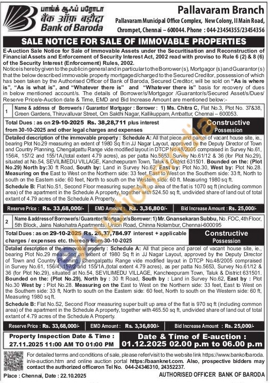 Detailed description of the immovable property: Schedule A: All that piece and parcel of vacant house site, le., bearing Plot No.29 measuring an extent of 1980 Sq ft in JJ Nagar Layout, approved by the Deputy Director of Town and Country Planning, Chengalpattu Range vide modified layout in DTCP No.48/2005 compraised in Survey No.61, 156/4, 157/2 and 155/1A, (total extent 4.79 acres), as per patta No.5653, Survey No.61/12 & 36 (for Plot No.29), situated at No.54, SEVILIMEDU VILLAGE, Kancheepuram Town, Taluk & District 631501. Bounded on the: (Plot No.29), North by: 30 ft Road, South by Land in Survey No.62, East by: Plot No.30 West by: Plot No.28. Measuring on the East to West on the Northern side: 33 feet, East to West on the Southem side: 33 ft, North to south on the Eastern side: 60 feet, North to south on the Western side: 60 ft, Measuring 1980 sq ft.