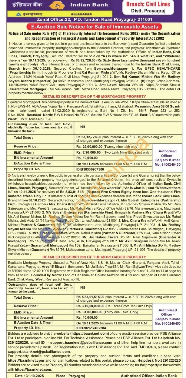 Equitable Mortgage Property situated at Part of Arazi No. 18 & 19, Mauza Chak Hiranand, Pargana- Arall, Tehsil Karcchana, Prayagraj, Area 15 Biswa in the name of Mr. Jai Babu Tiwari Si/o Mr. Ram Sajiwan Tiwari vide sale deed no 245/1999 dated 12.02.1999 Registered with Sub Registrar Office Karcchna bearing Bahi no 01, Jild no 14 at page no from 41 to 62 Bounded by North: Land of Harishankar, South: Arazi no 18 & 19 and Rest part of Chak Hiranand East: Chak Marg, West: Rest part of Arazino 18.
