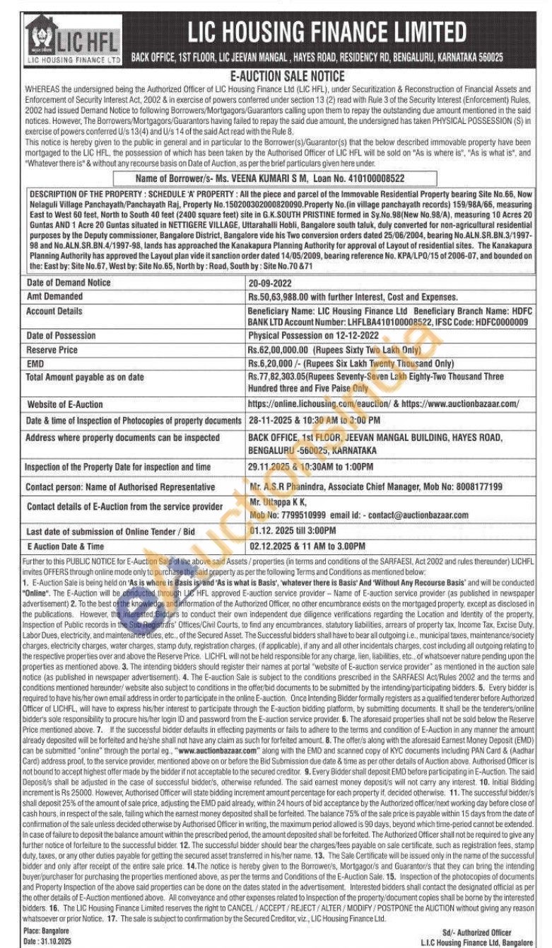 SCHEDULE A PROPERTY: All the plece and parcel of the immovable Residential Property bearing Site No.56, Now Nolaguli Village Panchayath/Panchayath Raj, Property No. 150200302000820090. Property No. (in village village panchayath records) 159/98A/66, measuring East to West 50 fent, North to South 40 fent (2400 square feet) site in G.K.SOUTH PRISTINE formed in Sy.No.98(New No.98/A), measuring 10 Acres 20 Guntas AND 1 Acre 20 Guntas situated in NETTIGERE VILLAGE, Uttarahalli Hobli, Bangalore south taluk, duly converted for non-agricultural residential purposes by the Deputy commissioner, Bangalore District, Bangalore vide his Two conversion orders dated 25/06/2004, bearing No.ALN.SR.BN 3/1997-98 and No.ALN.SR.BN.4/1997-98, lands has approached the Kanakapura Planning Authority for approval of Layout of residential sites. The Kanakapura Planning Authority has approved the Layout plan vide it sanction order dated 14/05/2009, bearing reference No. KPA/LPO/15 at 2006-07, and bounded an the: East by: Site No.67, West by: Site No. 65, North by: Road, South by: Site No.70&71