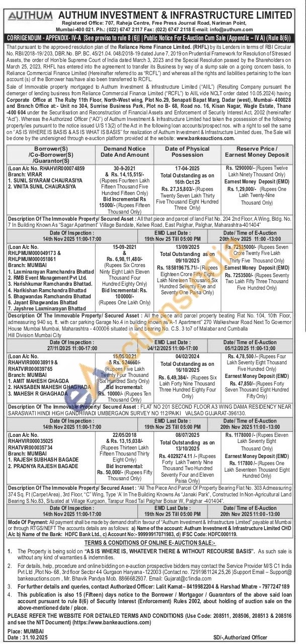 Description Of The Immovable Property/ Secured Asset: All the piece and parcel property beating Flat No. 104, 10th Floor, admeasuring 940 sq. ft. with car parking Garage No.4 in building known as A-1 Apartment" 270 Walkeshwar Road Next To Govemor House Mumbai Mumbai, Maharashtra-400006 situated in land bearing No. C.S. 3 to7 of Malabar and Cumballa Hill Division Mumbai City