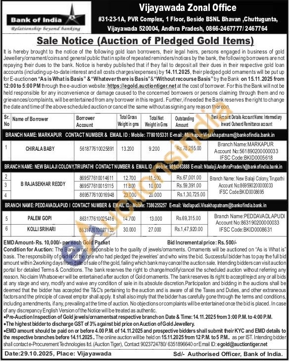 Bank of India Gold Auctions Auction in Visakhapatnam