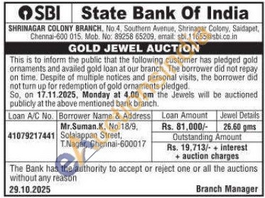 State Bank of India Gold Auctions Auction in Chennai