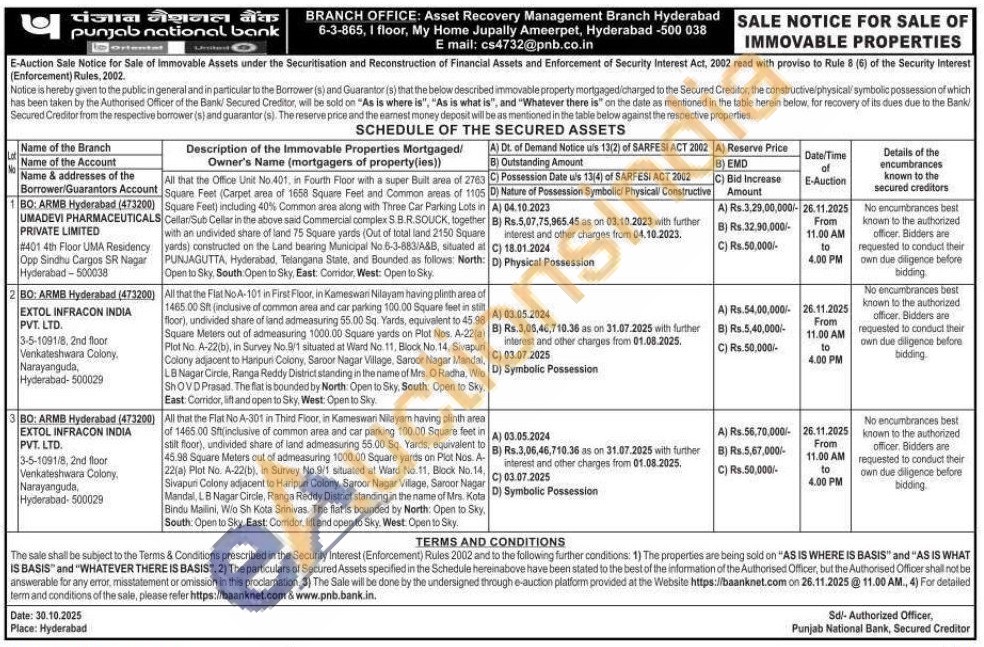 All that the Office Unit No 401, in Fourth Floor with a super Built area of 2783 Square Feet (Carpet area of 1658 Square Feet and Common areas of 1105 Square Feet) including 40% Common area along with Three Car Parking Lots in Cellar/Sub Cellar in the above said ComAll that the Flat No.A-101 in First Floor, in Kameswan Nilayam having plinth area of 1465.00 Sft (inclusive of common area and car parking 100.00 Square feet in still floor), undivided share of land admeasuring 55.00 Sq. Yards, equivalent to 45.98 Square Meters out of admeasuring 1000.00 Square yards on Plot Nos. A-22(a) Plot No. A-22(b), in Survey No 9/1 situated at Ward No. 11, Block No. 14, Sivapuri Colony adjacent to Haripuri Colony, Saroor Nagar Village, Saroor Nagar Mandal, LB Nagar Circle, Ranga Reddy District standing in the name of Mrs. O Radha, Wio ShOVD Prasad. The flat is bounded by North: Open to Sky, South: Open to Sky, East: Corridor, lift and open to Sky, West: Open to Skymercial complex S.B.R.SOUCK, together with an undivided share of land 75 Square yards (Out of total land 2150 Square yards) constructed on the Land bearing Municipal No.6-3-883/A&B, situated at PUNJAGUTTA, Hyderabad, Telangana State, and Bounded as follows: North: Open to Sky, South Open to Sky, East: Corridor, West: Open to Sky