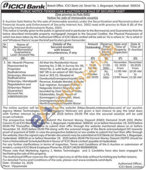 All that the Residential House bearing No. 2-96, in Survey No. 95, Ward No. 2. with built up area of 587 Sft in an extent of 363 Sqyds land or 303.15, Situated at DorakuntaGramapanchayathi and Revenue, Kodada Mandal, Kodada Sub-registrar, Suryopet District, Nalgonda District Registrar and bounded by East: House of Sattu Edukondalu, South: House of Kommagani Lakshmaiah, West Gramapanchayathi Bazar. North Gramapanchayathi Bazar
