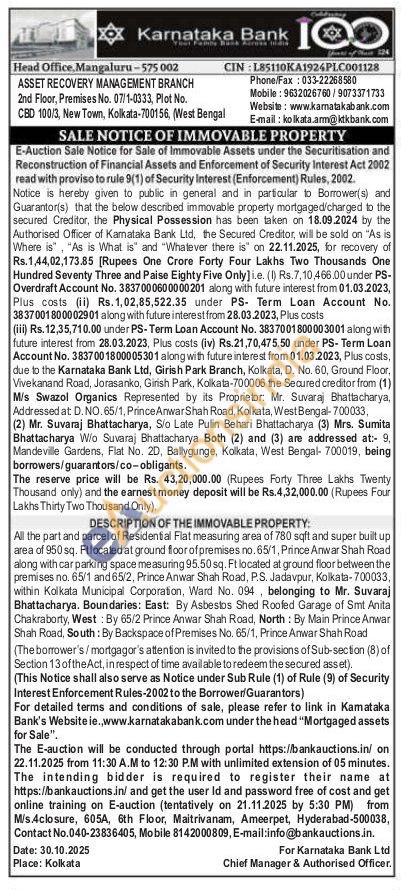 All the part and parcel of Residential Flat measuring area of 780 sqft and super built up area of 950 sq. Ftlocated at ground floor of premises no. 65/1, Prince Anwar Shah Road along with car parking space measuring 95.50 sq. Ft located at ground floor between the premises no. 65/1 and 65/2, Prince Anwar Shah Road, P.S. Jadavpur, Kolkata-700033, within Kolkata Municipal Corporation, Ward No. 094, belonging to Mr. Suvaraj Bhattacharya. Boundaries: East: By Asbestos Shed Roofed Garage of Smt Anita Chakraborty, West: By 65/2 Prince Anwar Shah Road, North: By Main Prince Anwar Shah Road, South: By Backspace of Premises No. 65/1, Prince Anwar Shah Road