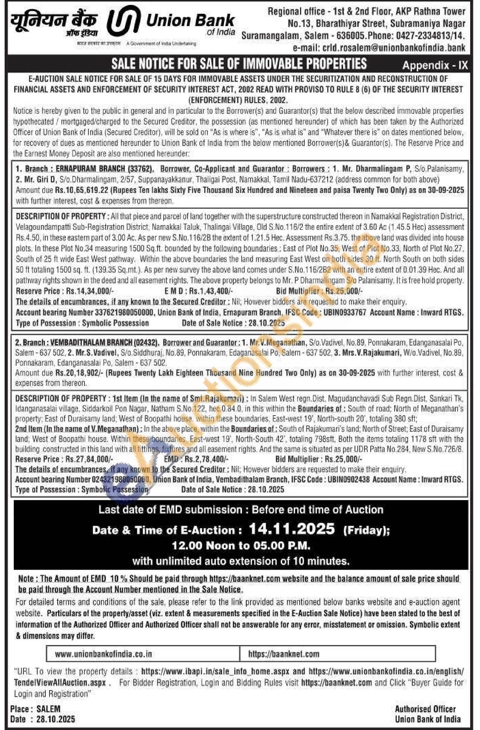 In Salem West regn. Dist. Magudanchavadi Sut Regn. Dist. Sankari Tk. Idanganasalai village, Siddarkoil Pon Nagar, Natham S.No.122, hec.0.84.0. in this within the Boundaries of: South of road: North of Meganathan's property, East of Duraisamy land; West of Boopathi house within these boundaries, East-west 19', North-south 20', totaling 380 sft; 2nd Item (In the name of V. Meganathan); In the above place, within the Boundaries of: South of Rajakumar's land, North of Street, East of Duraisamy land, West of Boopathi house. Within these boundaries. East-west 19, North-South 42, totaling 798sft, Both the items totaling 1178 sft with the building constructed in this land with all fittings, fixtures and all easement rights. And the same is situated as per UDR Patta No.284, New S.No. 726/8.