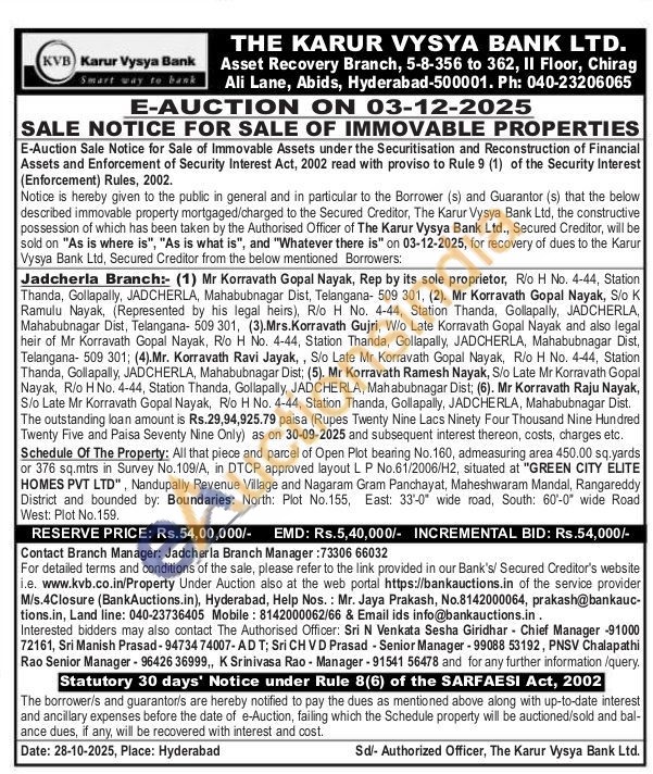 All that piece and parcel of Open Plot bearing No.160, admeasuring area 450.00 sq.yards or 376 sq.mtrs in Survey No.109/A, in DTCP approved layout LP No.61/2006/H2, situated at "GREEN CITY ELITE HOMES PVT LTD", Nandupally Revenue Village and Nagaram Gram Panchayat, Maheshwaram Mandal, Rangareddy District and bounded by: Boundaries: North: Plot No.155, East: 33'-0" wide road, South: 60-0" wide Road West: Plot No.159.