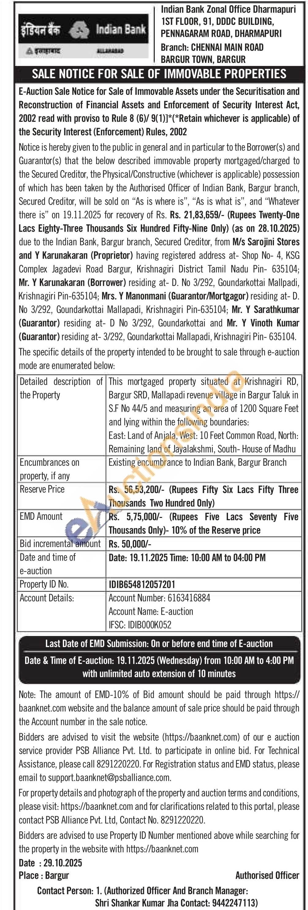 This mortgaged property situated at Krishnagiri RD, Bargur SRD, Mallapadi revenue village in Bargur Taluk in SF No 44/5 and measuring an area of 1200 Square Feet and lying within the following boundaries: East: Land of Anjala, West: 10 Feet Common Road, North: Remaining land of Jayalakshmi, South-House of Madhu