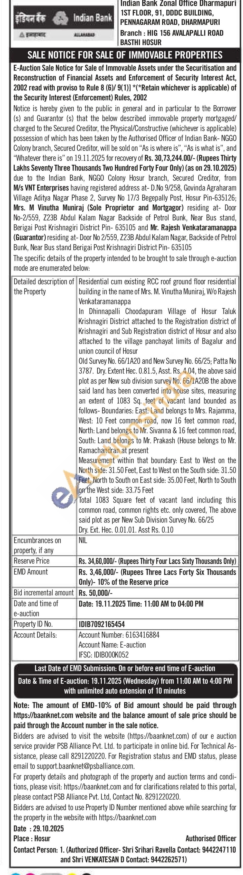 Residential cum existing ROC roof ground floor residential building in the name of Mrs. M. Vinutha Muniraj, Wo Rajesh Morikataramanaopa In Dhinnapalli Choodapuram Village of Hosur Taluk Krishnagiri District attached to the Registration district of Krishnagiri and Sub Registration district of Hosur and also attached to the village panchayat limits of Bagalur and union council of fiosur Old Survey No. 66/1420 and New Survey No. 66/25; Patta No 3787. Dry Extent Her: 0.81.5. Asst. Rs. 4.04, the above said pint as per New sub division survey No. 66/14208 the above said land has been comerted into house sites, measuring an rodent of 1083 Sq. feet of vacant land bounded as follows- Boundaries East Land belongs to Mrs. Rajamma, West: 110 Foot common read, now 16 fent common road, North: Land belongs to Mr. Sivanna & 16 feet common mad, South: Land belongs to Mr. Prakash (House belongs to M Ramachandran at present Measurement within that houndary, Fast to West on the North side 31.50 Feet, East to West on the South side-31.50 Feet, North to Sauth on East side: 35.00 Feet, North to South on the West side 33.75 Feet Total 1083 Square feet of vacant land including this common road, common rights etc. only covered. The above said piot as per New Sub Division Survey No. 66/25 Dry. Ext. Hec. 0.01.01. Asst Rs: 0.10