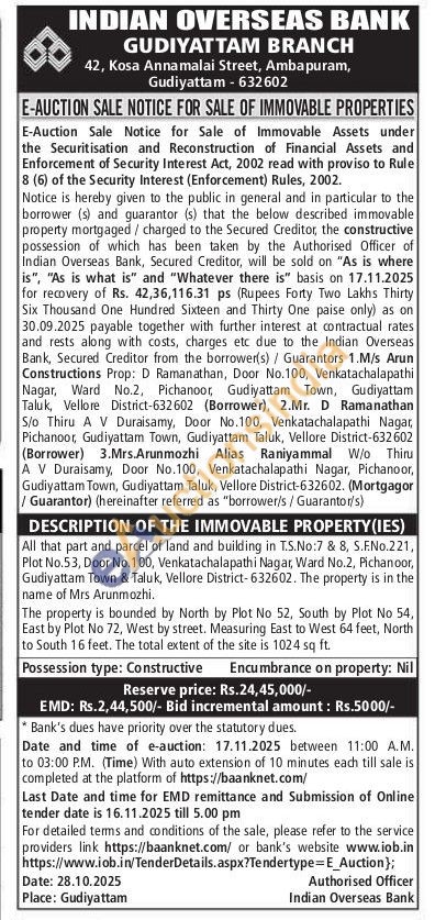 All that part and parcel of land and building in T.S.No:7 & 8, S.F.No.221, Plot No.53, Door No. 100, Venkatachalapathi Nagar, Ward No.2, Pichanoor, Gudiyattam Town & Taluk, Vellore District-632602. The property is in the name of Mrs Arunmozhi.
