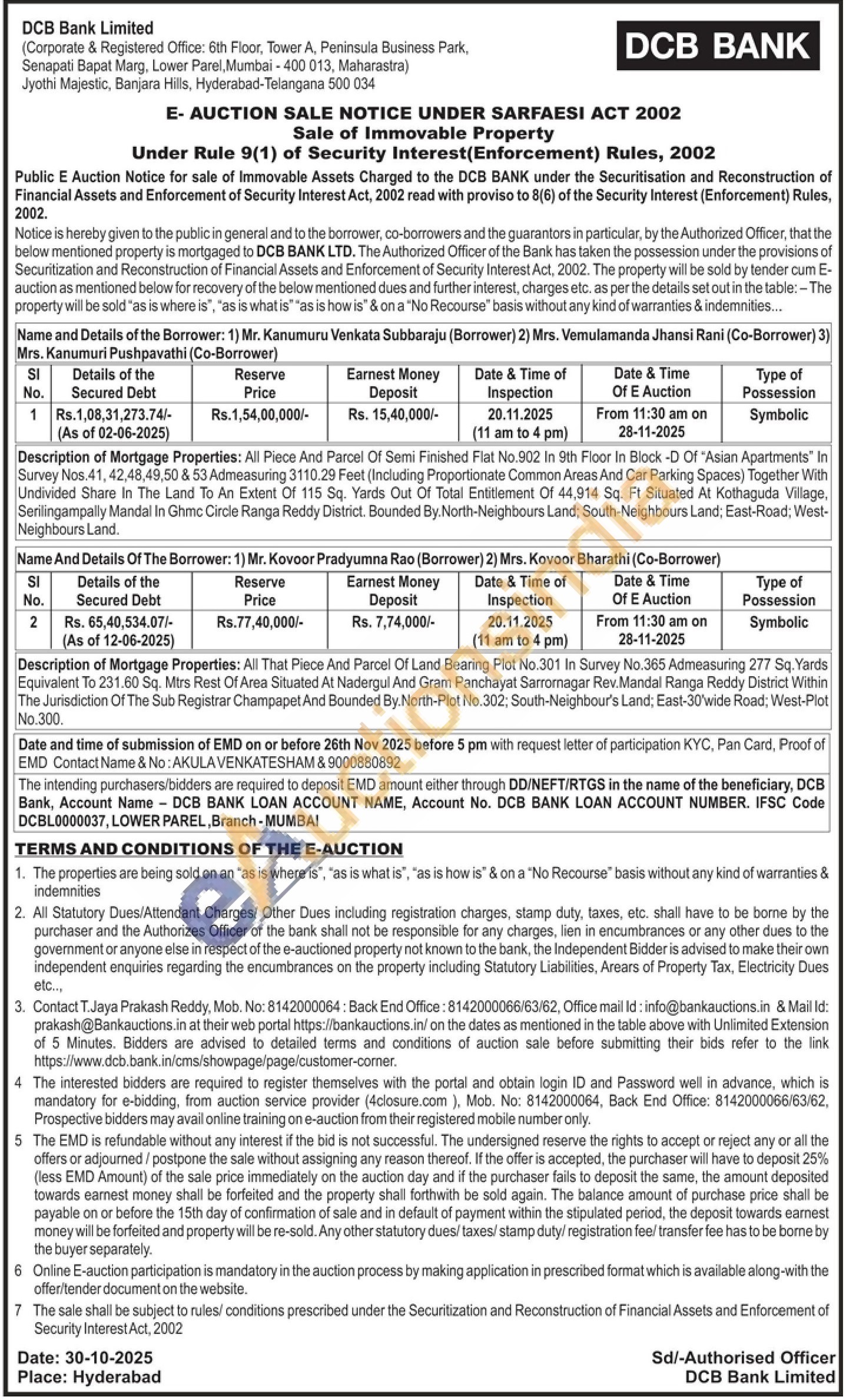 Description of Mortgage Properties: All That Piece And Parcel Of Land Bearing Plot No.301 In Survey No.365 Admeasuring 277 Sq. Yards Equivalent To 231.60 Sq. Mtrs Rest Of Area Situated At Nadergul And Gram Panchayat Sarrornagar Rev. Mandal Ranga Reddy District Within The Jurisdiction Of The Sub Registrar Champapet And Bounded By. North-Plot No.302; South-Neighbour's Land; East-30 wide Road: West-Plot No.300