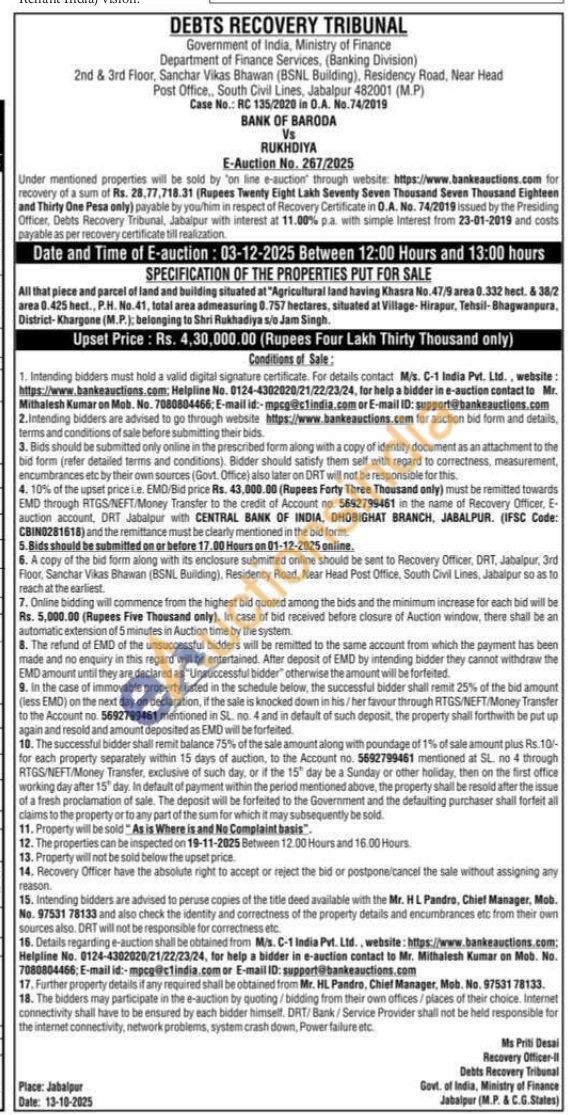 All that piece and parcel of land and building situated at "Agricultural land having Khasra No.47/9 area 0.332 hect. & 38/2 area 0.425 hect., P.H. No.41, total area admeasuring 0.757 hectares, situated at Village-Hirapur, Tehsil-Bhagwanpura, District-Khargone (M.P.); belonging to Shri Rukhadiya s/o Jam Singh.