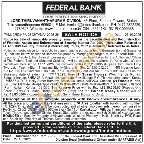 All the piece and parcel of the land measuring 5.70 Ares together with building with number TC 1/297(1) existing and/or to be constructed and all other improvements thereon comprised in Re-Sy No. 295/2 (Old Sy No. K 280/2) in Block No.11 of Kazhakuttom Village, Thiruvananthapuram Taluk, Thiruvananthapuram District, Kerala State within the registration Sub District of Kazhakuttom, BOUNDED on East by: Property of Vidyadharan, West by: Property of Haiju, North by: PWD Road and South by: Property of Thomas Dcruz and Jaseentha.