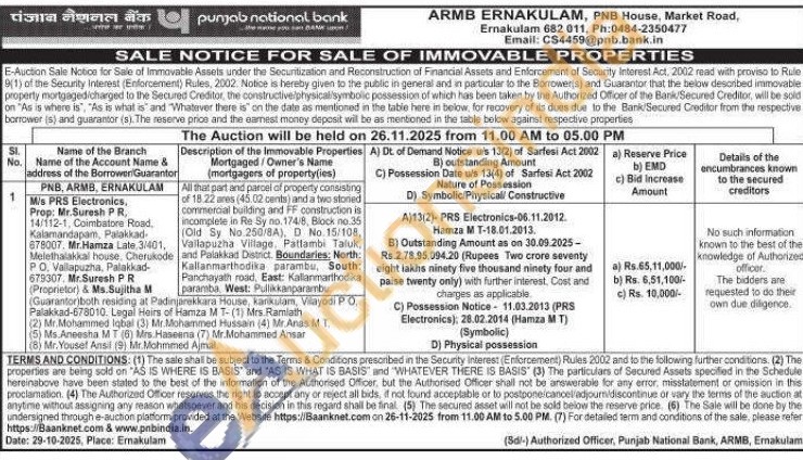 All that part and parcel of property consisting of 18.22mes (45.02 cents) and a two stoned commercial building and FF construction is incomplete in Re Sy no. 174/8, Block no.35 (Old Sy No.250/8A), D No. 15/108, Vallapuzha Village Pattambi Taluk and Palakkad District. Boundaries: North: Kallanmarthodika parambu, South: Panchayath road, East: Kallanmarthodika paraniba. West: Pullikkanparambu