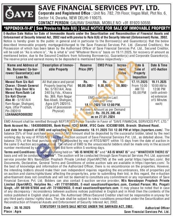 All that piece and parcel Property bearing Plot No. 5/187/A/4, Area 240 Sq. Yds., Khasra No. 369, Ram Nagar Nao Abadi, Shahganj, Agra (UP) 282010. (Type of possession Physical)