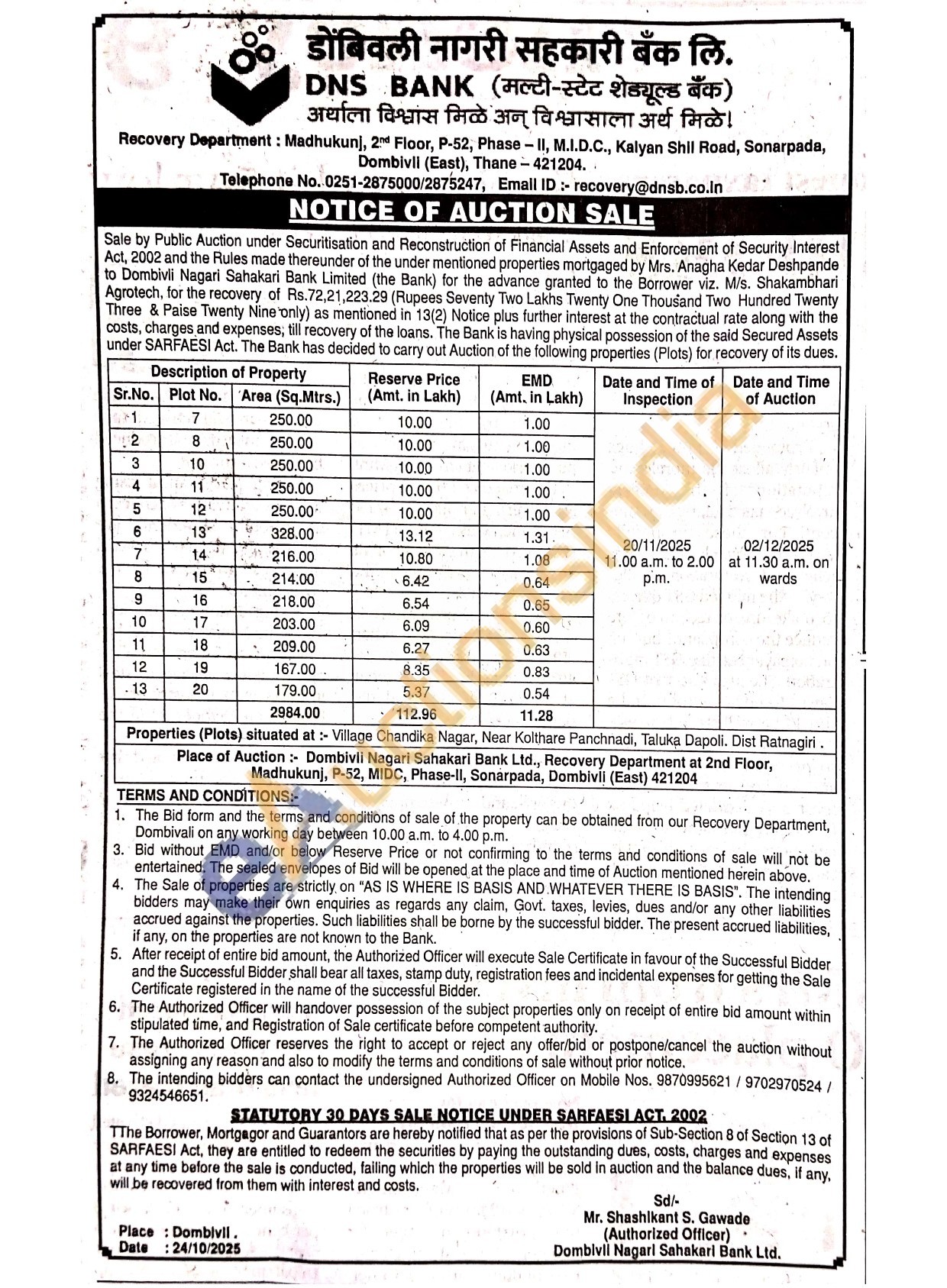 Authorized Officer on Mobile Nos. 9870995621/9702970524/ 9324546651.