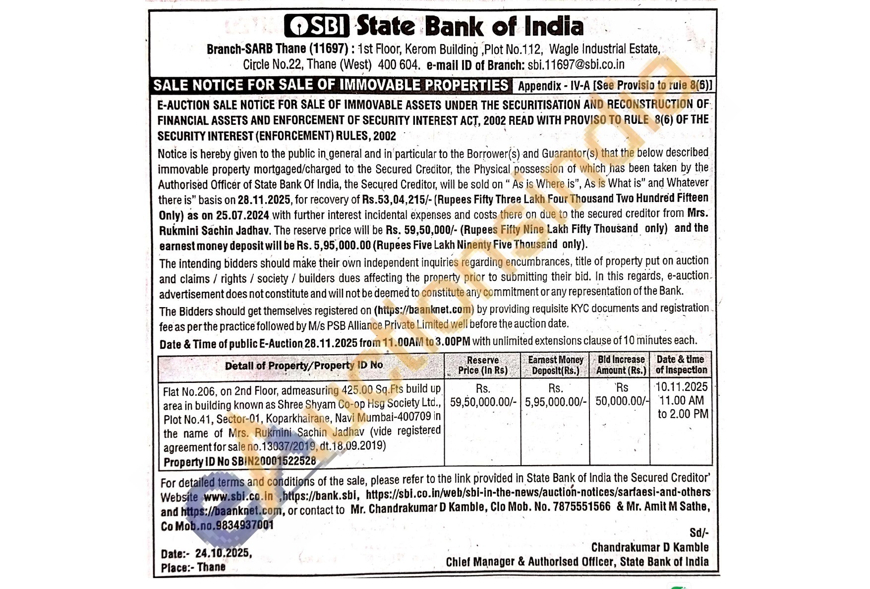 Flat No.206, on 2nd Floor, admeasuring 425.00 Sq. Fts build up area in building known as Shree Shyam Co-op Hsg Society Ltc., Plot No.41, Sector-01, Koparkhairane, Navi Mumbai-400709 in the name of Mrs. Rukmini Sachin Jadhav (vide registered agreement for sale no.13037/2019, dt. 18.09.2019) Property ID No SBIN20001522528
