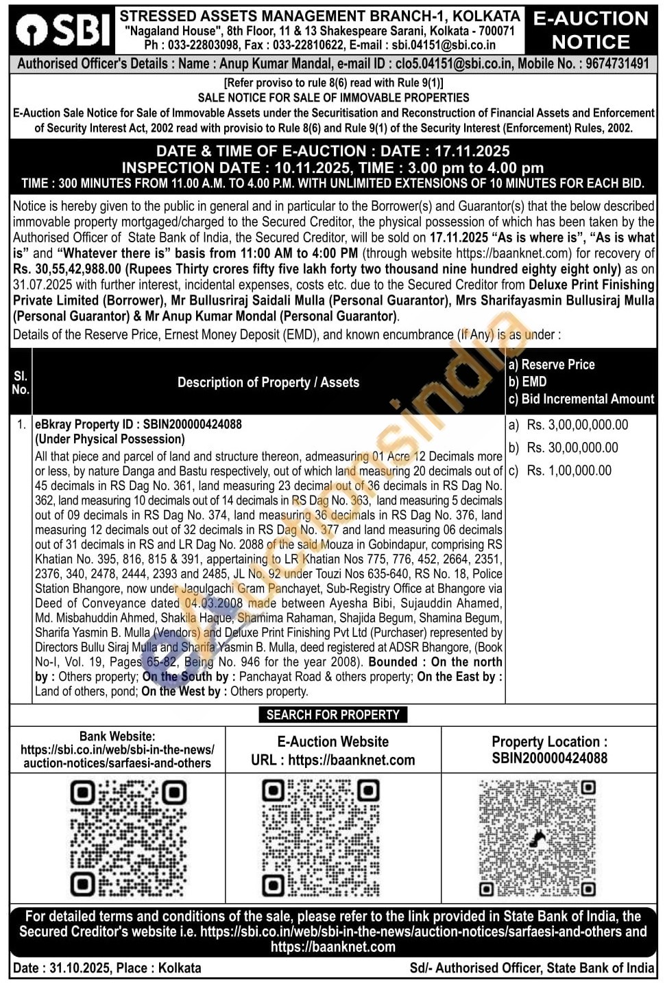 All that piece and parcel of land and structure thereon, admeasuring 01 Acre 12 Decimals more or less, by nature Danga and Bastu respectively, out of which land measuring 20 decimals out of 45 decimals in RS Dag No. 361, land measuring 23 decimal out of 36 decimals in RS Dag No. 362, land measuring 10 decimals out of 14 decimals in RS Dag No. 363, land measuring 5 decimals out of 09 decimals in RS Dag No. 374, land measuring 36 decimals in RS Dag No. 376, land measuring 12 decimals out of 32 decimals in RS Dag No. 377 and land measuring 06 decimals out of 31 decimals in RS and LR Dag No. 2088 of the said Mouza in Gobindapur, comprising RS Khatian No. 395, 816, 815 & 391, appertaining to LR Khatian Nos 775, 776, 452, 2664, 2351, 2376, 340, 2478, 2444, 2393 and 2485, JL No. 92 under Touzi Nos 635-640, RS No. 18, Police Station Bhangore, now under Jagulgachi Gram Panchayet, Sub-Registry Office at Bhangore via Deed of Conveyance dated 04.03.2008 made between Ayesha Bibi, Sujauddin Ahamed, Md. Misbahuddin Ahmed, Shakila Haque, Shamima Rahaman, Shajida Begum, Shamina Begum, Sharifa Yasmin B. Mulla (Vendors) and Deluxe Print Finishing Pvt Ltd (Purchaser) represented by Directors Bullu Siraj Mulla and Sharifa Yasmin B. Mulla, deed registered at ADSR Bhangore, (Book No-l, Vol. 19, Pages 65-82, Being No. 946 for the year 2008). Bounded: On the north by: Others property; On the South by: Panchayat Road & others property; On the East by: Land of others, pond; On the West by: Others property
