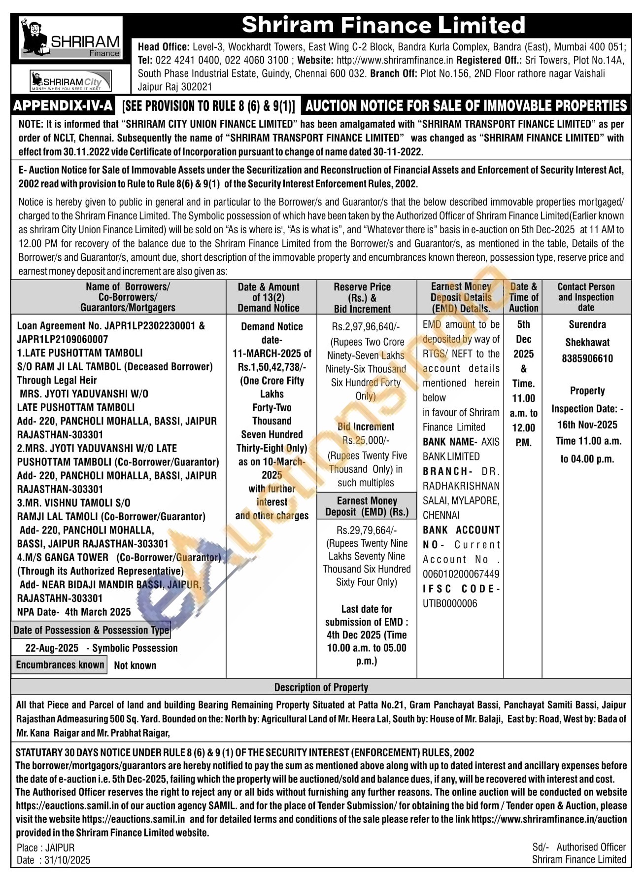 All that Piece and Parcel of land and building Bearing Remaining Property Situated at Patta No.21, Gram Panchayat Bassi, Panchayat Samiti Bassi, Jaipur Rajasthan Admeasuring 500 Sq. Yard. Bounded on the: North by: Agricultural Land of Mr. Heera Lal, South by: House of Mr. Balaji, East by: Road, West by: Bada of Mr. Kana Raigar and Mr. Prabhat Raigar