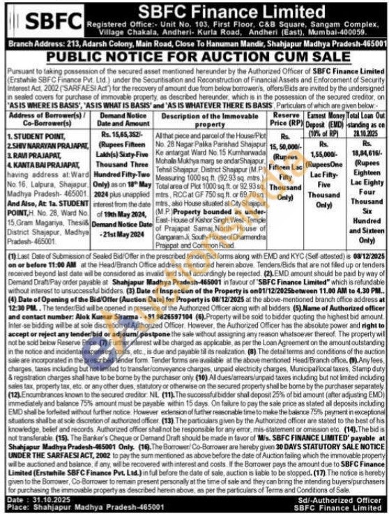 All that piece and parcel of the House/Plb No. 28 Nagar Palika Parishad Shajapur Ke antargat Ward No. 15 Kumharwada Mchala Mukhya marg se andar Shajapur Tehsil Shajapur District Shajapur (MP) Measuring 1000 sq.ft. (92.93 sq. mrs.) Total area of Plat 1000 sq. ft. or 92.93 sq. mtrs, RCC at GF 750 sq ft. or 69.70sq mtrs, also House situated at City Shajapur (M.P Property bounded as under-Eant-House of Kishor Singh, West-Temple of Prajapat Samaj, North House of Gangaram Ji South-House of Dharmendra Prajapat and Common Road