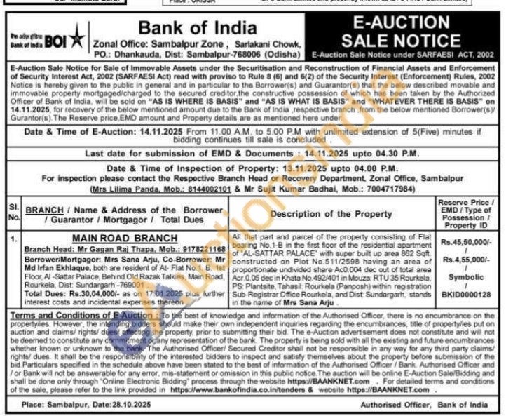 All that part and parcel of the property consisting of Flat bearing No.1-B in the first floor of the residential apartment of AL-SATTAR PALACE" with super built up area 862 Sqft constructed on Plot No 511/2598 having an area of proportionate undivided share Ac0.004 dec out of total area Acr. 0.05 dec in Khata No.492/401 in Mouza: RTU 35 Rourkela, PS Plantsite, Tahasil Rourkela (Panposh) within registration Sub-Registrar Office Rourkela, and Dist. Sundargarh, stands in the name of Mrs Sana Arju
