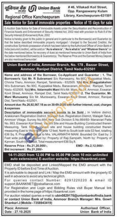 In Vellore district, Arakkonam Registration District, Walajah Sub. Registration District, Walajah Taluk, Ammoor Village, Survey No.664, New Sub Division S No.664/60- Manaivari Patta No. 663. Eswaran Koil Street, Vacant Site and House Building Constructed therein Measuring. Tank Street, Vacant site and house building constructed therein measuring East to West both side 12 feet, North to South both side 53 feet, totalling 636 Sq. ft. Property belongs to Mrs. VALARMATHI MANI. Bounded On: East by. 3 Feet wide public way. West by: Property of Raji, Sampath, North by: Property of Kannan, South by: Street, Total measurement 636 Sq.ft.