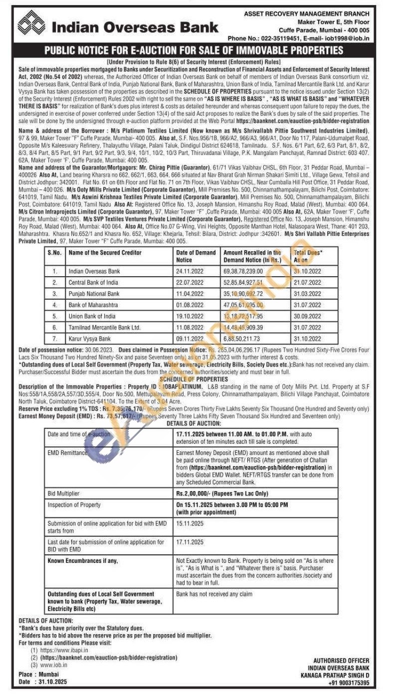 L&B standing in the name of Ooty Mills Pvt. Ltd. Property at S.F Nos 558/1A 558/24 557/30 556/4, Door No.500. Mettupalayam Road, Press Colony, Chinnamathampalayam, Bilichi Village Panchayat. Coimbatore North Taluk, Coimbatore District-641104. To the Extent of 3.04 Acre
