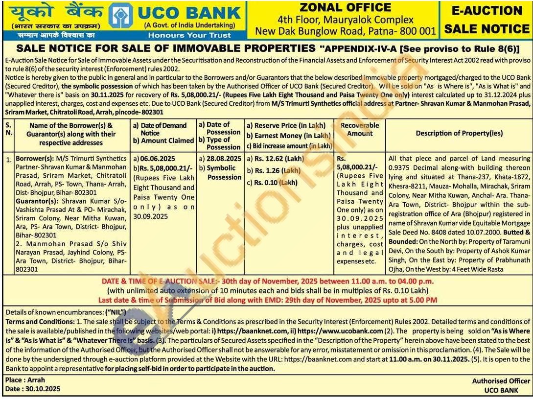 All that piece and parcel of Land measuring 0.9375 Decimal along-with building thereon lying and situated at Thana-237, Khata-1872, Khesra-8211, Mauza- Mohalla, Mirachak, Sriram Colony, Near Mitha Kuwan, Anchal- Ara. Thana-Ara Town, District- Bhojpur within the sub-registration office of Ara (Bhojpur) registered in name of Shravan Kumar vide Equitable Mortgage Sale Deed No. 8408 dated 10.07.2000. Butted & Bounded: On the North by: Property of Taramuni Devi, On the South by: Property of Ashok Kumar Singh, On the East by: Property of Prabhunath Ojha, On the West by: 4 Feet Wide Rasta