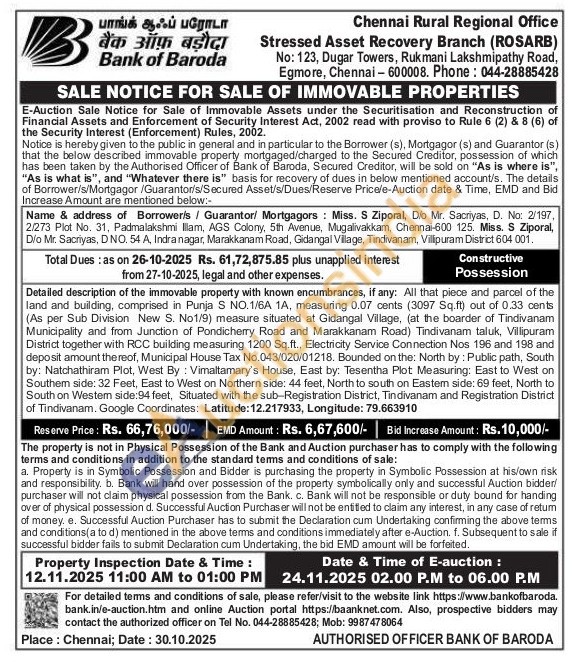Detailed description of the immovable property with known encumbrances, if any: All that piece and parcel of the land and building, comprised in Punja S NO.1/6A 1A, measuring 0.07 cents (3097 Sq.ft) out of 0.33 cents (As per Sub Division New S. No1/9) measure situated at Gidangal Village, (at the boarder of Tindivanam Municipality and from Junction of Pondicherry Road and Marakkanam Road) Tindivanam taluk, Villipuram District together with RCC building measuring 1200 Sq.ft., Electricity Service Connection Nos 196 and 198 and deposit amount thereof, Municipal House Tax No.043/020/01218. Bounded on the: North by: Public path, South by: Natchathiram Plot, West By: Vimaltamary's House, East by: Tesentha Plot Measuring: East to West on Southem side: 32 Feet, East to West on Northern side: 44 feet, North to south on Eastem side: 69 feet, North to South on Westem side:94 feet, Situated with the sub-Registration District, Tindivanam and Registration District of Tindivanam. Google Coordinates: Latitude: 12.217933, Longitude: 79.663910