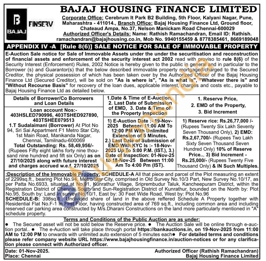 Description of the Immovable Property: SCHEDULE-A All that piece and parcel of the Plot measuring an extent of 2299sq.ft., bearing Plot No.94, Metro Star City, comprised in Old Survey urvey No. 10/3 Part, New Survey No.10/17, as per Patta No.6933, situated at No.91, Kunrathur Village, Sriprembudur Taluk, Kancheepuram am District, within the Registration District of Chennai South and Sun-Registration District of Kunrathur, bounded on the North by: Plot No.95, South by: Land in survey No. 10/1, East by: 30 Feet Wide Road, West by: Plot No.96 SCHEDULE-B: 398sq.ft., Undivided share of land in the above reffered Schedule A Property together with Residential Flat No.F-1 in First Floor, having constructed area of 769 sq.ft., including common area and including reserved car parking area constructed by M/s. Dharani Constructions on the land more particularly mentioned in "A" schedule property.
