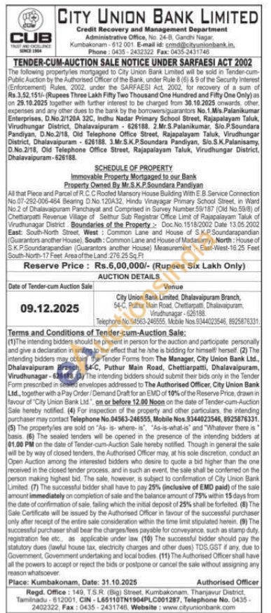 All that Piece and Parcel of R.C.C Roofed Mansory House Building With EB Service Connection No.07-292-006-464 Bearing D No. 120A32. Hindu Vinayagar Primary School Street, in Ward No 2 of Chalavaipuram Panchayat and Comprised in Survey Number: 59/187 (Old No.59/8) of Chettarpatti Revenue Village of Seithur Sub Registrar Office Limit of Rajapalayam Tasluk of Wrudhunagar District