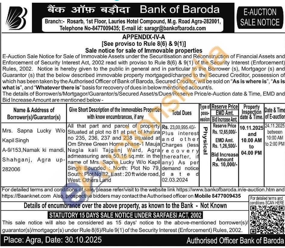 All that part and parcel of Situated at plot no 81 at part of no 235, 236, 237 and 238 situated Om Shree Green Home phase-1 Nagla kali Tajganj Ward, admeasuring area 50.16 sq.mtr. name of Mrs. Sapna Lucky W/o Singh Bounded: North: Plot No South: Plot No 82, East: 20 ft wide West: Others Land