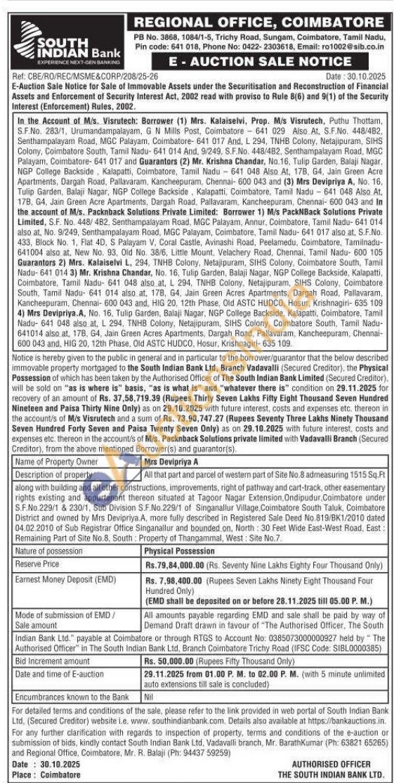 All that part and parcel of western part of Site No.8 admeasuring 1515 Sq.Ft along with building and all other constructions, improvements, right of pathway and cart-track, other easementary rights existing and appurtenant thereon situated at Tagoor Nagar Extension, Ondipudur, Coimbatore under S.F.No.229/1 & 230/1, Sub Division S.F. No.229/1 of Singanallur Village, Coimbatore South Taluk, Coimbatore District and owned by Mrs Devipriya A, more fully described in Registered Sale Deed No.819/BK1/2010 dated 04.02.2010 of Sub Registrar Office Singanallur and bounded on, North: 30 Feet Wide East-West Road, East: Remaining Part of Site No.8, South: Property of Thangammal, West: Site No.7.