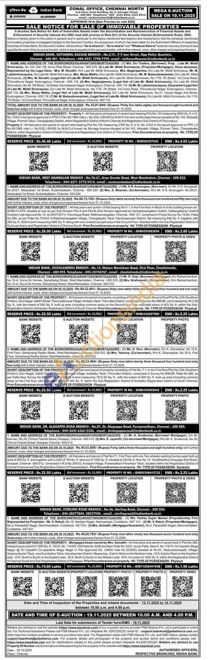 PROPERTY: All that piece and portion of flat bearing No.F-1 in the First floor in Block A of the building known as SONA FLATS situated at now as per Sub Division Plot A and Plot B (Sub Division approved by Venkatamangalam Uratchi, Kattangalathur Uratchi Ondriam vide Approval No. 10, dt.20/07/2011), Panchayat Road, Rathinamangalam. Chennai-600 127, comprised in Punja Survey No. 72/5A, Patta No.590, as per Patta No.72/5A2 of Rathinamangalam Village, Chengalpattu Taluk, Kancheepuram District, flat measuring 846 Sq. ft. together with 395 Sq. ft. UDS in land measuring 4382 Sq. ft. along with one covered car park area in the Ground Floor. Situated within the Sub Registration District of Guduvancherry and Registration District of Chennai South. Prior Encumbrances on property: Nil. TYPE OF POSSESSION: Physical