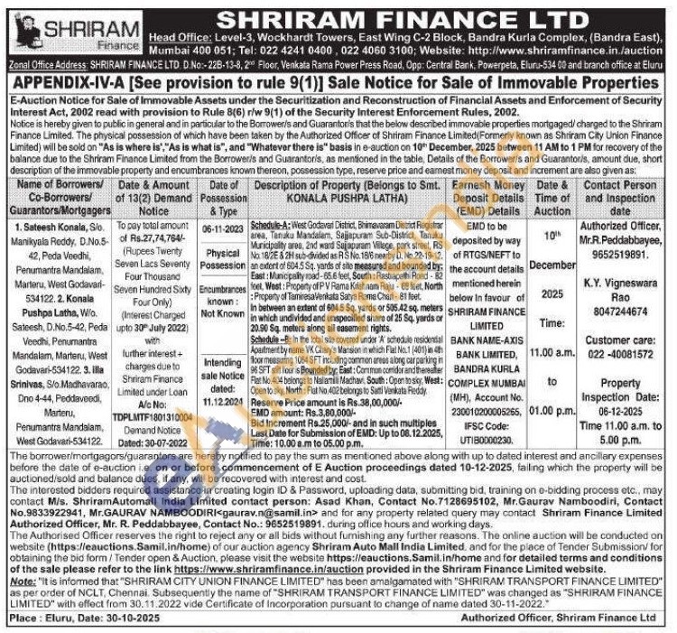 Schedule-A: West Godavari District, Bhimavaram District Registror area, Tanuku Mandalam, Sajjapuram Sub-District, Tanuku Municipality ares, 2nd ward Sajapuram Villege, park street, RS No 18/25 82H sub-divided as RS No. 186 nearby D. No.22-19-12. an extent of 604.5 Sq. yards of sile measured and bounded by: East: Municipality road-65.6 feet, South: Rastrapathi Road-82 feel, West: Property of PV Rama Krishnam Raju - 65 feet. North Property of Tamiresa Venkata Satya Rame Chari-81 feet. In between an extent of 604.5 Sq. yards or 505.42 sq. meters in which undivided and unspecified share of 25 Sq, yards or 20.90 Sq. meters along all easement rights. in Schedule-Bin the total site covered under A schedule residential Apartment by name VK Chary's Mansion in which Flat No.1 (401) in th floor measuring 1064 SFT including common aneus along car parking 96 SFT sit foor's Bounded by: East: Common comidorandithereer Flat No. 404 belongs to Nalarm Madhav, South: Open to scy: West: Open to slky, North: Flat No. 402 belongs to Satti Venkata Reddy